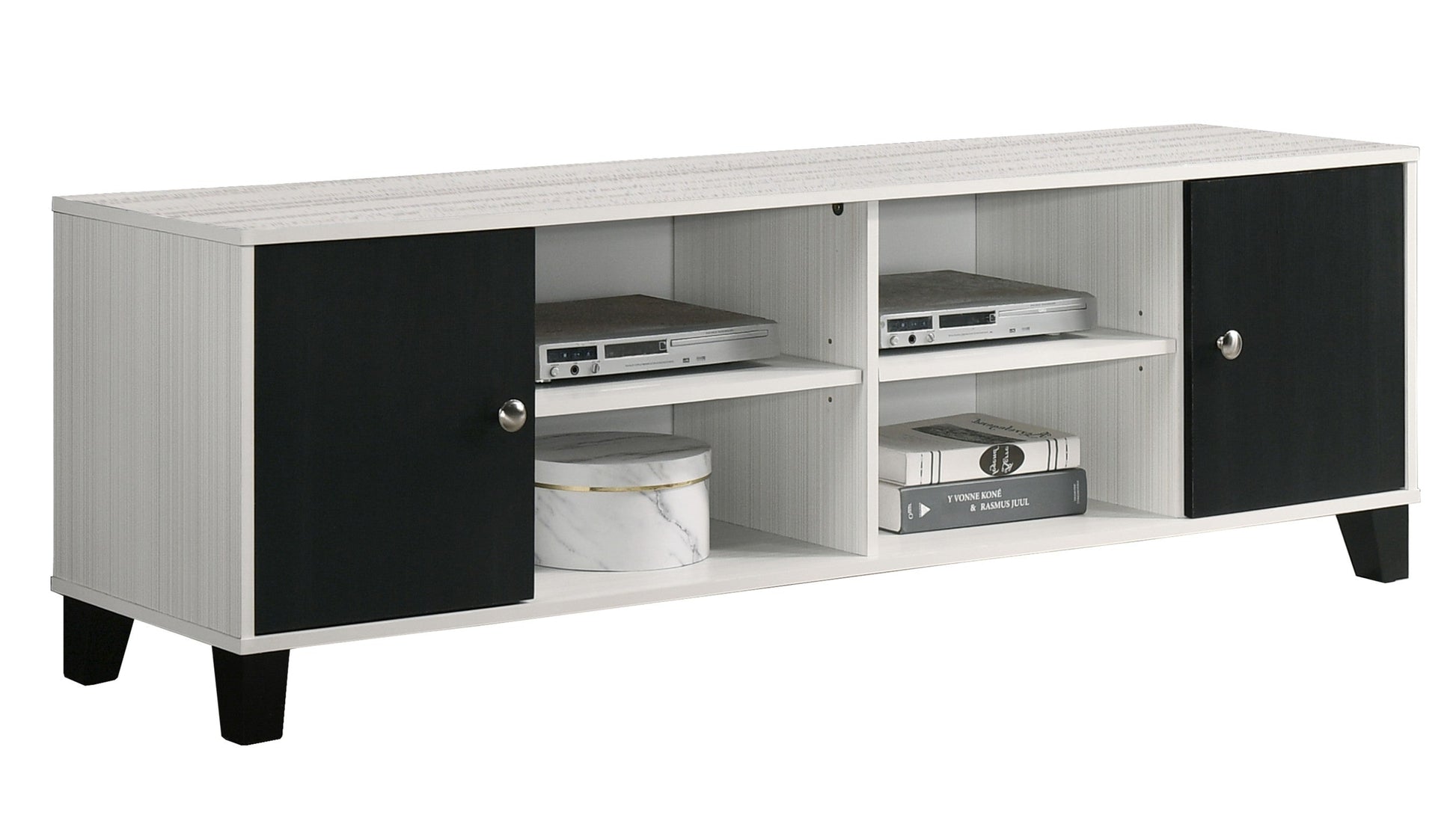 The Akerson Tv Stand offers a sleek and modern design with a white and black color combination. Its minimalist aesthetic will elevate any living room while providing ample storage space for your entertainment needs. Its sturdy construction ensures durability for long-term use.