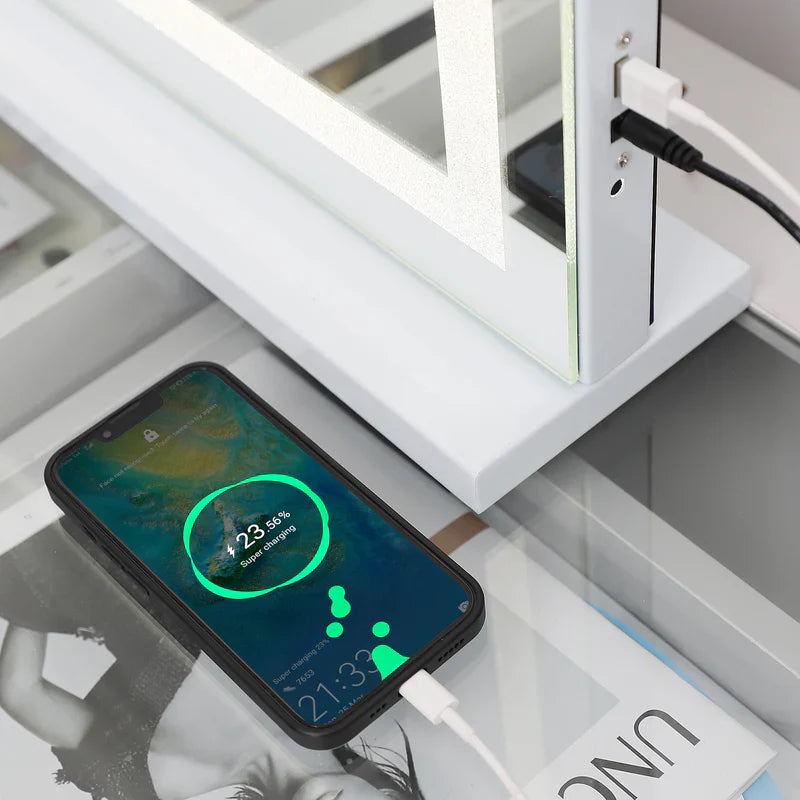 Bring Hollywood glam to your vanity with the Crystal Hollywood Vanity Mirror. The LED light strip provides adjustable brightness and 3 light temperatures for perfect lighting every time. Play your favorite tunes with the built-in Bluetooth speaker and keep your phone charged with the USB port. The smart touch control and memory function make getting ready a breeze. Plus, the detachable base allows for both mirror and wall hanging options. Elevate your beauty routine with this must-have mirror.