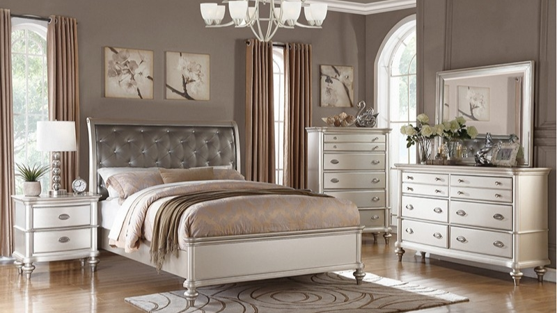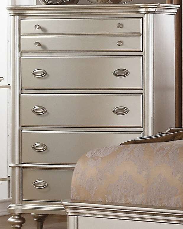 Introducing the F91' Chest - a stunning addition to any bedroom. This five-drawer chest features a mix of champaign handle pulls and round knobs for a unique and elegant look. The champagne finish adds a touch of luxury to your space. Organize your room with style!