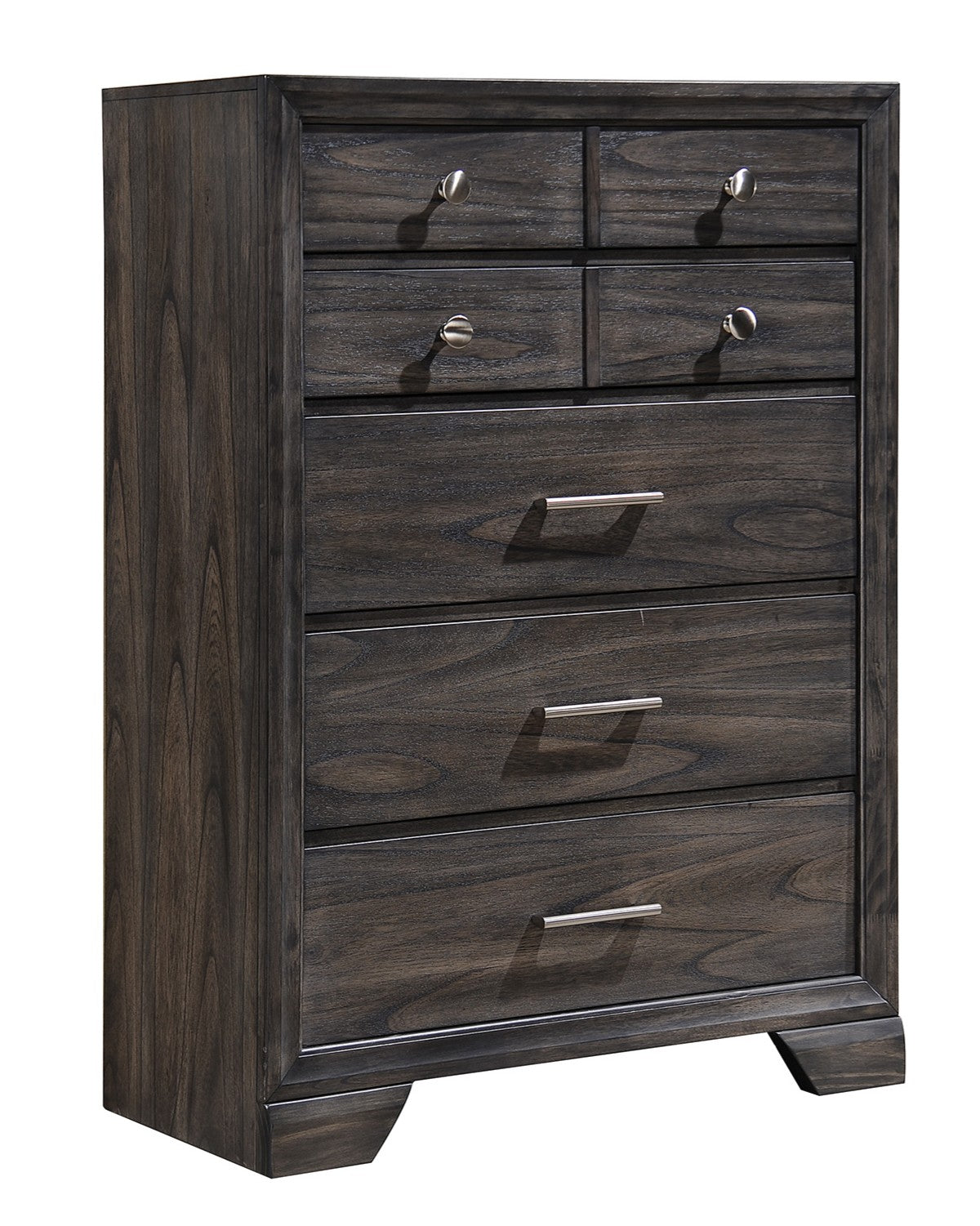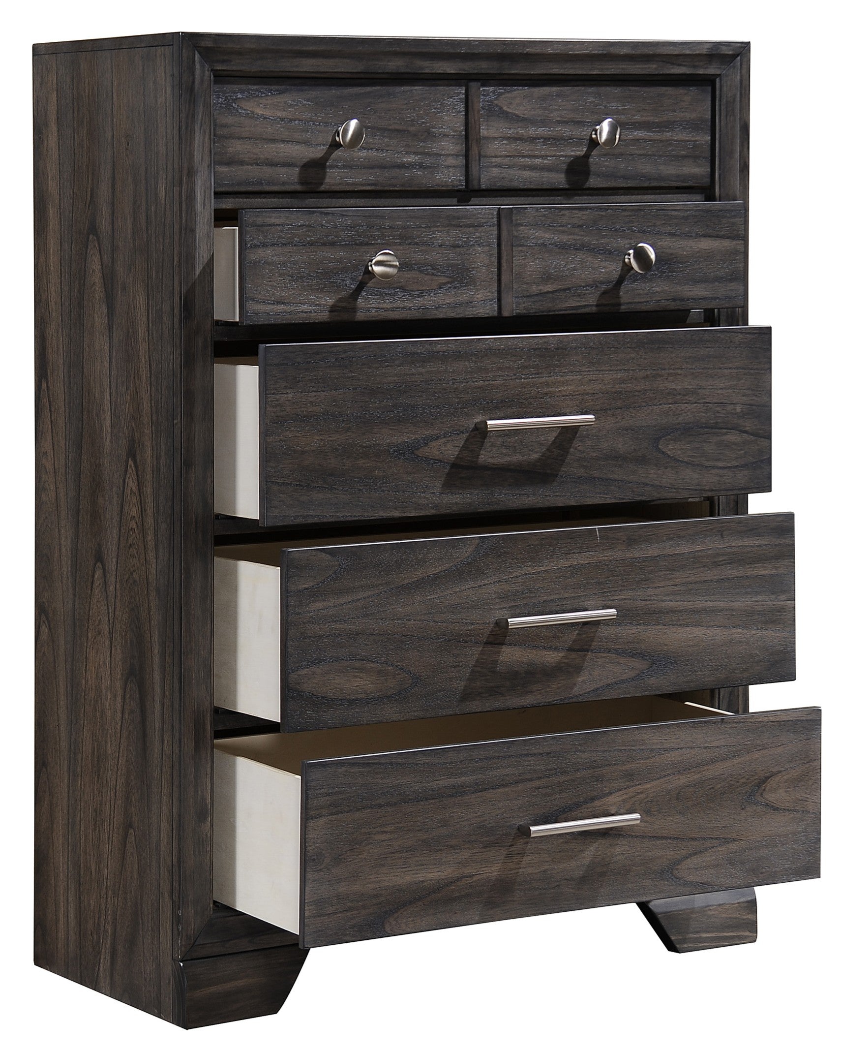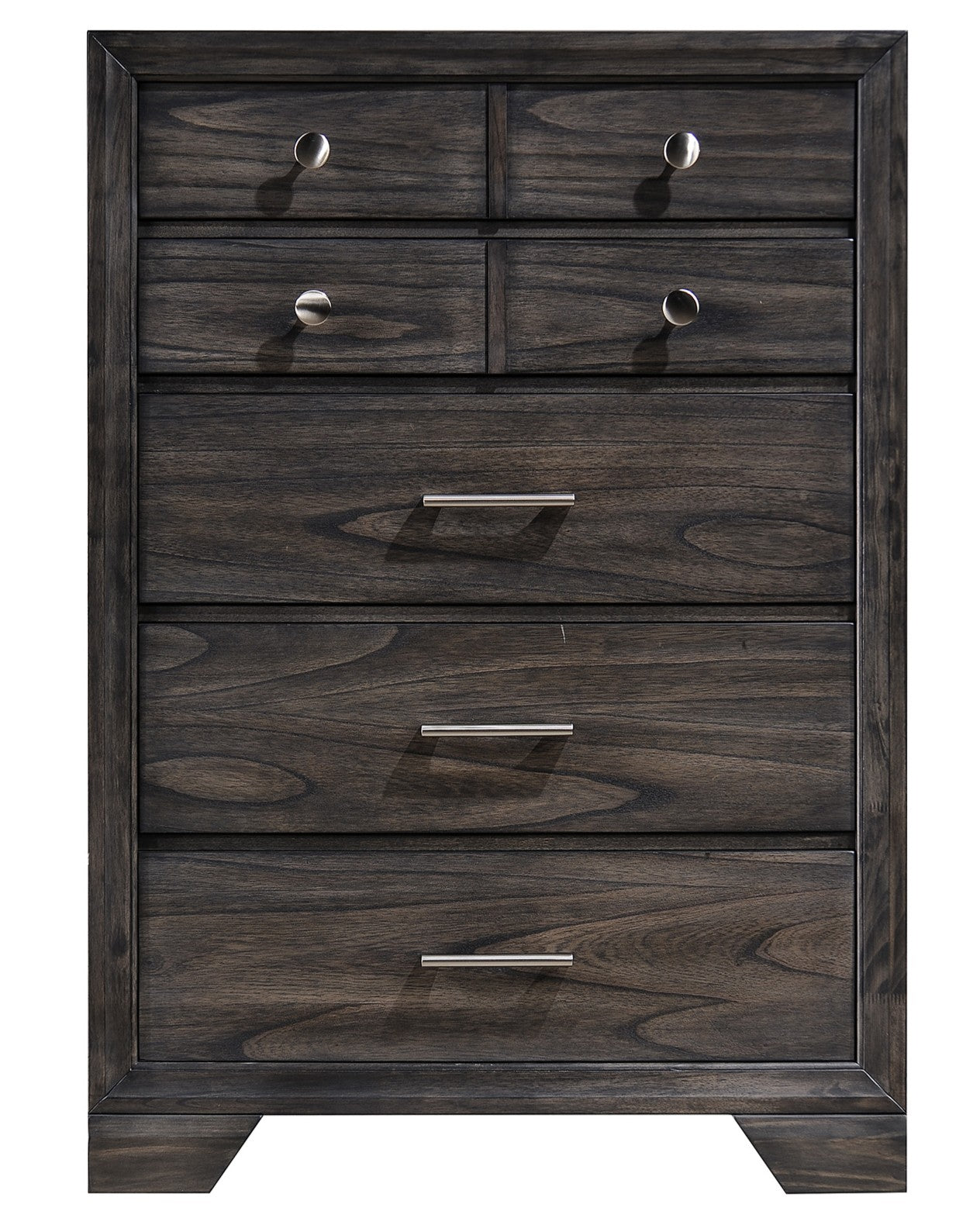 Elevate your bedroom with the Jaymes Chest! This beautiful five-drawer chest features four round knobs and three metal handles on the drawers, adding a touch of elegance to its sleek grey wooden finish. Keep your belongings organized and add a stylish focal point to your room.
