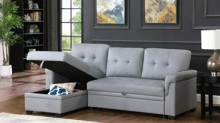 The Lexi Reversible Sleeper Sectional Sofa offers both style and functionality. Made with vegan leather, it is a sustainable and animal-friendly choice. The reversible storage chaise allows for versatile seating and also provides a convenient storage solution. Perfect for small spaces or for anyone looking for a multi-purpose sofa.