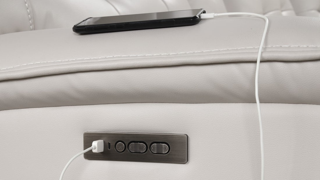 Introducing the Palma Oversized Power-Recliner. Elegant and exclusive, this plush sectional boasts 6 powers for ultimate relaxation. Made with luxurious leather gel material (100% polyester) in a sophisticated sand color, the Palma is perfect for a tasteful and comfortable addition to any living space.