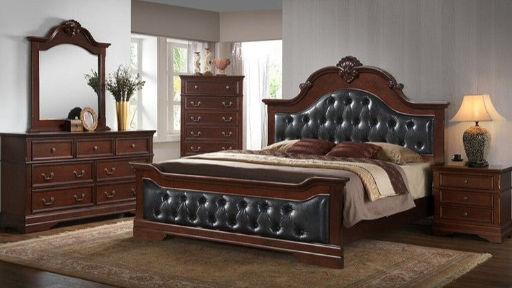 Introducing Sonesta - the perfect combination of style and functionality. Made with dark walnut wood and a black PU button tufted headboard and footboard, this bed is sure to elevate your bedroom. Plus, it has convenient bottom drawer glides for extra storage. Goodbye clutter, hello Sonesta!